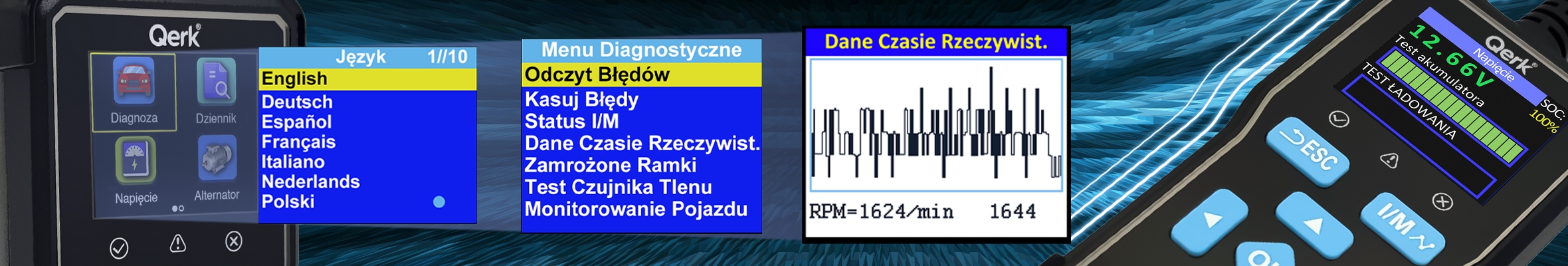 ✅ Dodatkowe funkcje: test akumulatora, test alternatora, test rozruchu.